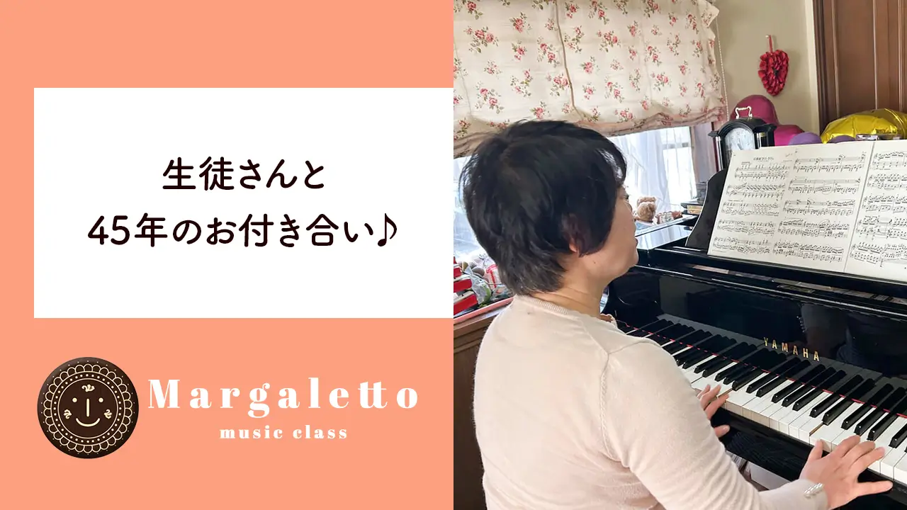 マーガレットちゃんレッスン始められてから 45年お付き合いの淳子先生は、私が昔 中学校の教育実習をした時の生徒さんで、私が音楽教室を開講した時に入会されました(現在音楽教室主宰)♪